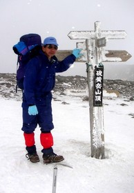 山頂の気温はマイナス7度。撮影10分後に、噴火口側(写真奥の断崖)に滑落。4月学友会が『ヤマ屋をしのぶ会ならば』、生前の最期の写真となった。