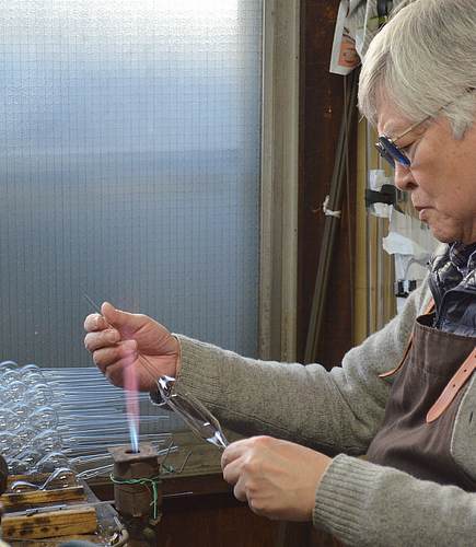 原材料のガラス管を、円柱形で両端が尖った形で、所定の長さに切断する<管引き>。ひょうたん型の形成から始まる、その後の作業が、<バーナーワーク>と呼ばれる。